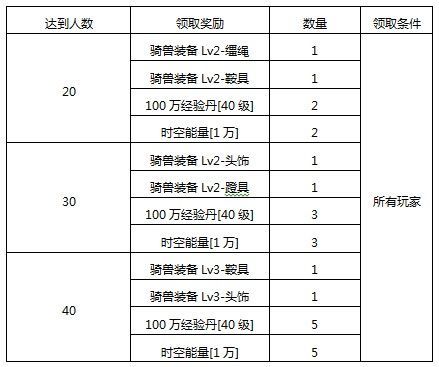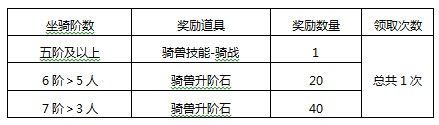 活动规则:开服前3天,只要坐骑达到一定阶数,即可获得奖励。如果有多人达成,更可以领取更多奖励。