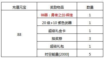 开服前3天内,只要首次充值88元宝(即大于RMB8.8),即可获得大量超值道具,快人一步,从此开始!