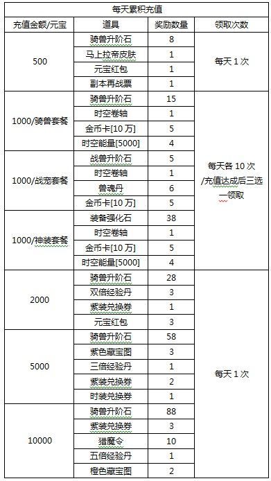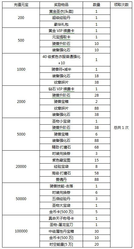活动规则:开服1-7天内累计充值达到一定金额,各种强悍道具都属于你!