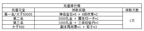 活动期间,只要您充值大于500元宝,即可获得大礼。同时我们将在每一个服务器开启充值排行榜,如果您最终能够达到排行榜前三名,更多超值大礼等着您哦!