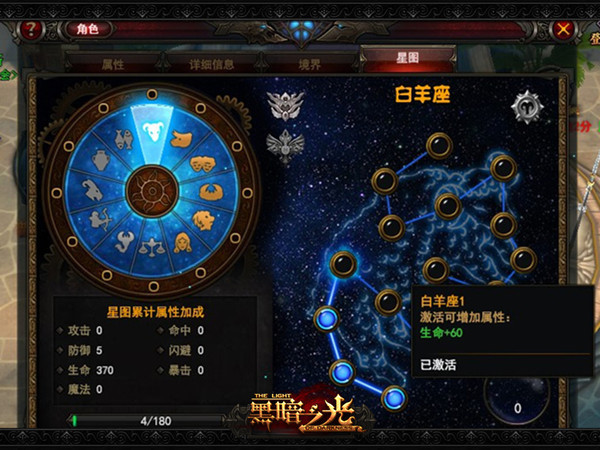 在星图系统中激活星座可提升生命、防御、攻击、闪避等战斗属性,不同的星座和星位提升的属性和级别都不同。例如,白羊座可以增加生命值,共有15个星位,从第一级开始生命值不断递增;金牛座可以提高防御力;双子座提高攻击性;狮子座提高命中率等等。12星座共有上百个星位等待玩家一一去点亮!