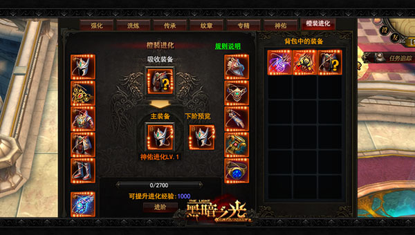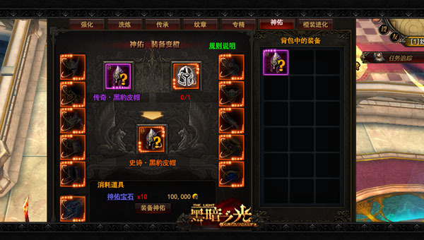 装备神佑是一种提升战力的全新方法,玩家只需消耗特定的装备部件与一些神佑宝石和金币,通过神佑洗礼,即可将紫色传奇级装备进阶为更加强大的同等级橙色史诗级装备。