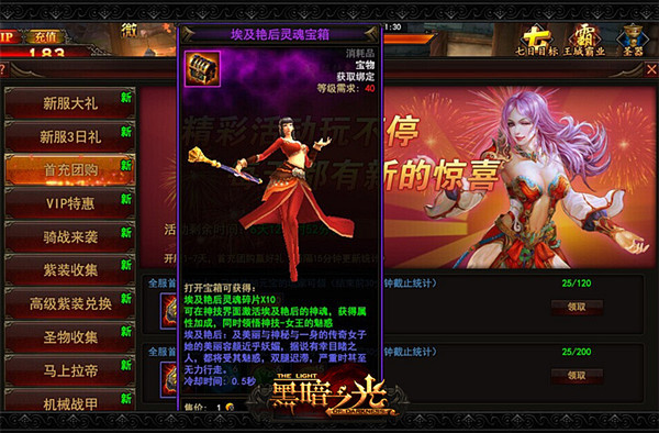 首充团购活动,新服开设1-7天,全服首充达到一定人数即可得到埃及艳后灵魂宝箱,开启埃及艳后的神魂技能。人数统计每隔15分钟更新一次,活动结束前30分钟将结束统计。