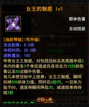 神技“女王的魅惑”可对包括目标及其周围半径3米内的最多3个单位造成自身攻击力103%的伤害,以及50点额外伤害。另有几率使目标瞬间扣掉50%的体力值,并且在6秒内,一旦体力低于50,速度将瞬间降低30,减速效果将持续3秒。