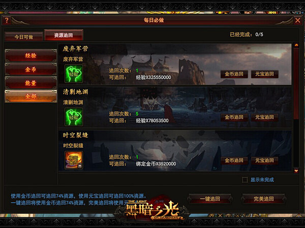 想拥有时光机让时光倒流吗?想把错过的东西找回来吗?点击“资源追回”即可查看前一天未参加或未完成的副本和活动,并追回相关经验、金币和能量等奖励。选择“一键追回”或是“完美追回”来获取奖励;“一键追回”使用金币追回资源,可追回74%;“完美追回”则使用元宝追回资源,追回率可达100%。
