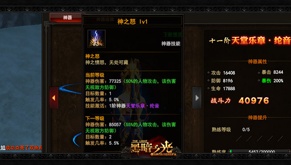 神器拥有神之怒技能,在攻击时有几率触发,触发后造成额外伤害,并附带特殊效果。高等级的神器拥有更多特殊效果,如减少敌人的暴击率、闪避率等Debuff。无论在pk还是副本中都称之为神技也不为过!