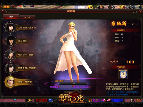 各种男神、女神齐聚“诸神圣殿”。玩家需通过神魂魔晶与灵魂碎片来激活神魂从而获得神魂技能。神魂技能分为主动技能和被动技能两种,互有增减作用,合理激活将有奇妙效果。装载神魂技能后可有效增强角色战斗力、提高伤害输出并附带额外效果。