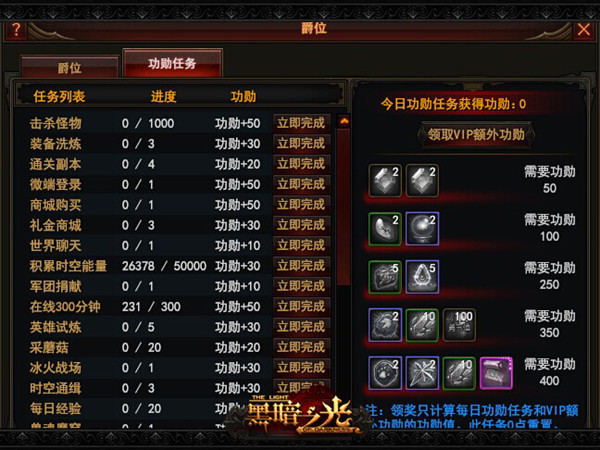 爵位晋升主要是通过完成功勋任务来实现的,同时还可获得额外奖励,奖励包括贤者之石、战兽升阶石等商城道具。功勋任务于每日凌晨0:00刷新,当日未领取的功勋奖励在刷新后则无法领取,不想前功尽弃的朋友可要牢记啊。