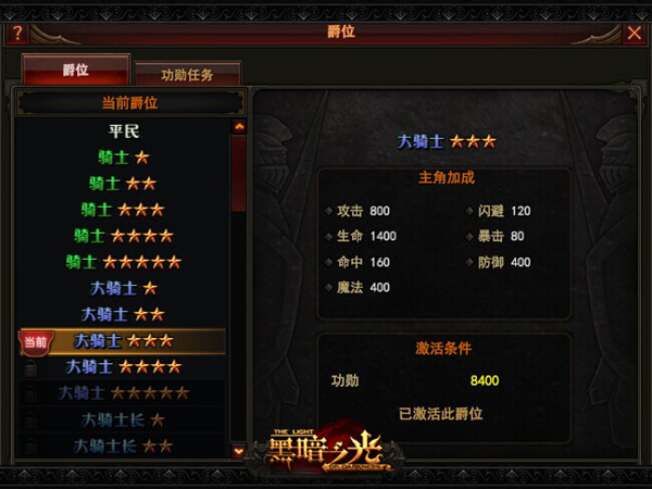 爵位系统的初始状态为平民,共有10级,分别为骑士、大骑士、大骑士长、勋爵、男爵、子爵、伯爵、侯爵、公爵、大公爵。爵位越高,角色的属性加成越多。