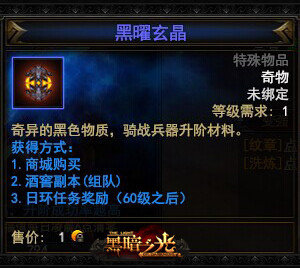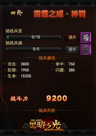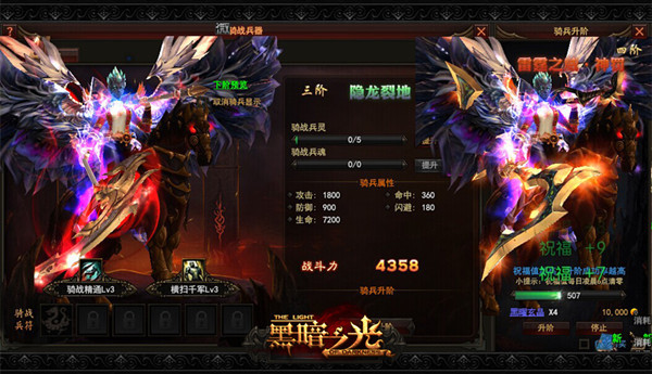 骑兵的升阶需消耗一定的黑曜玄晶,可在酒窖副本(组队)和日环任务中获得。与魂器相同,每次升阶都会增加祝福值,祝福值越高,升阶成功率就越高;当祝福值满时,升阶必定成功。