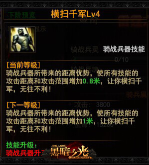 横扫千军:骑战兵器所带来的距离优势,使所有技能的攻击距离和攻击范围增加,让你横扫千军,无往不利!每提升一阶攻击距离增加0.2米,6阶以后群攻技能的范围将变得史无前例之大!