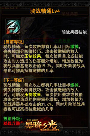 骑战精通:每次攻击都有几率让目标缴械,丧失部分防御技巧。攻击被缴械的敌人时,可触发压制效果。每次使用普通攻击或技能攻击对方造成的伤害额外增加,升阶骑战兵器也可提高抵抗缴械的几率。