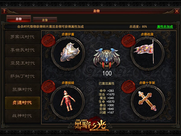 获得各时代圣物碎片可激活圣物,部分圣物带有攻击和暴击属性,有利于提高秒伤。