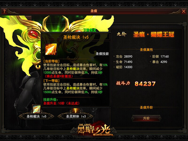 圣痕系统的升阶可提升攻击和暴击属性的加成,更有圣枪裁决技能可对目标造成暴伤。
