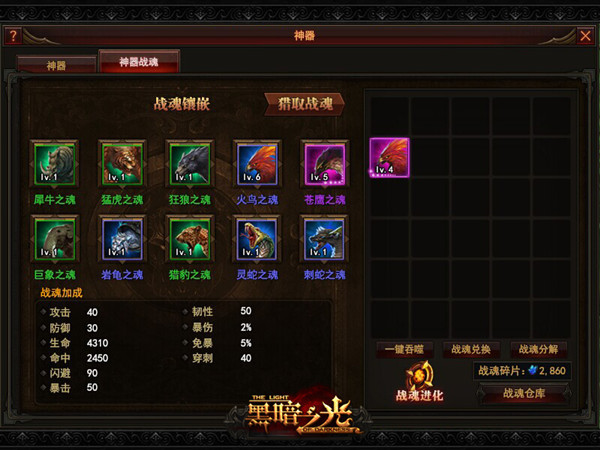 神器战魂系统通过猎取战魂镶嵌到神器上,从而获得属性加成。神器只能镶嵌8个战魂,要想提升秒伤可以优先选择猎豹之魂和猛虎之魂来增加暴击属性和攻击属性。