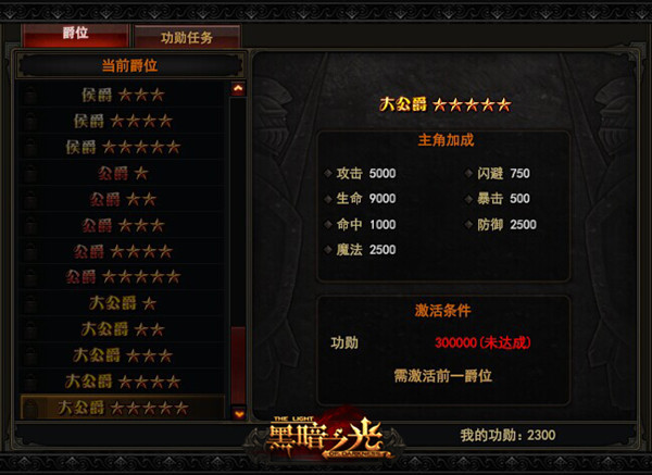 功勋是加官进爵的重要凭证,完成特定任务可获得功勋。功勋的积累可使玩家从平民一路晋升为大公爵,增加攻击、暴击等属性。