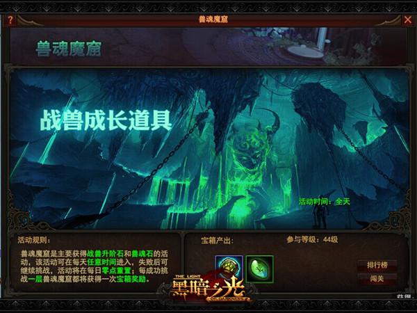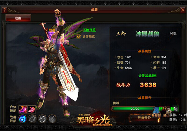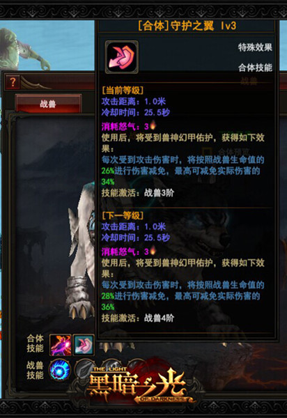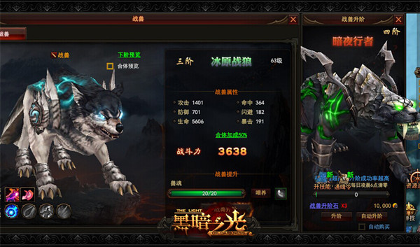 3D硬派格杀双端网游360《黑暗之光》中的战兽系统不同于其他游戏中的战宠类系统,不仅拥有战兽本身的技能和属性,更可将战兽与角色合体来提高战斗力。十大时空战兽已经准备好了,各位玩家快来唤醒它们体内潜藏的能量吧!