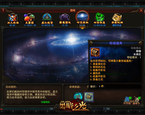 时空探秘:在梦幻般的银河中蕴藏着大量的奇珍异宝,在获得时空能量的同时还会收获骑兽升阶石和属性丹。