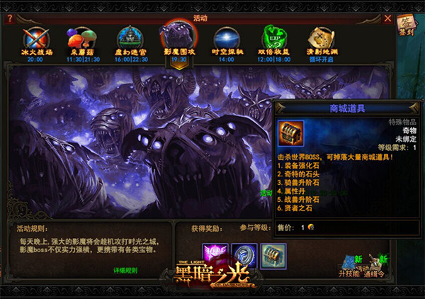 影魔围攻:每到夜晚,大批影魔就会趁机攻打时光之城,影魔BOSS不仅实力强大还携带着骑兽升阶石等各类宝物。