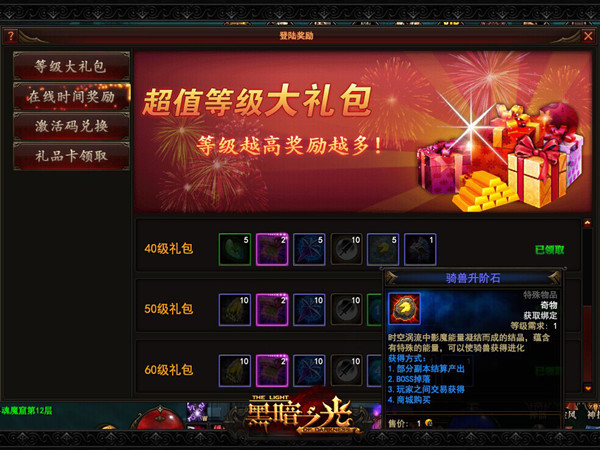 系统奖励:玩家达到40级后可获得系统奖励的超值等级大礼包,其中就包括骑兽升阶石哦,快快升级吧!