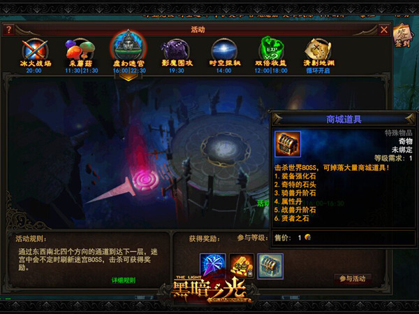 虚幻迷宫:在虚幻迷宫中与“真实”和“虚幻”两位使者对话并击杀迷宫BOSS可获得骑兽升阶石等丰厚奖励。