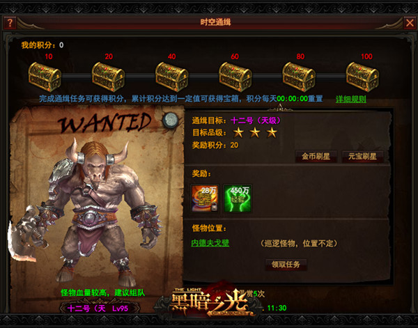 由于时空错乱,不同级别的罪犯都开始趁机在各时空中流窜。为了将一些高级的罪犯绳之以法,时空通缉开启更高额的悬赏。达到80级以上的玩家可来到纳杰夫荒漠和内德夫戈壁来寻找通缉犯,将罪犯捉拿归案可得到大量赏金和经验。
