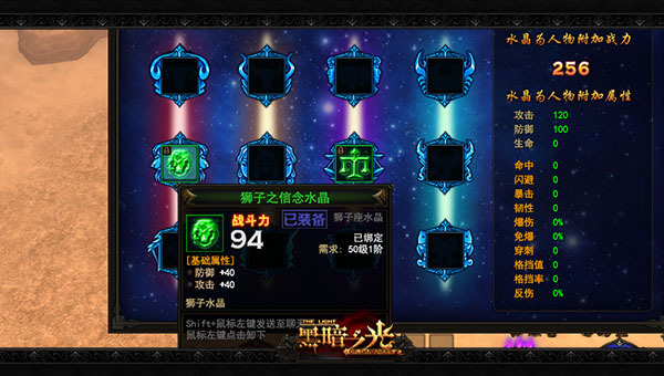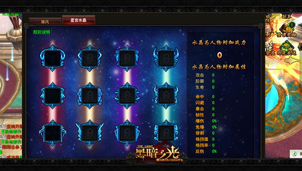 星宫水晶是将具有星系能量的水晶镶嵌到角色披风中,获得属性能力上的提升。一名角色身上总共能镶嵌12颗宝石,分别对应着古老的十二星座之力。低品质的水晶只会提高角色的攻防血基础属性,高品质的水晶具有穿刺、爆伤等特殊属性。