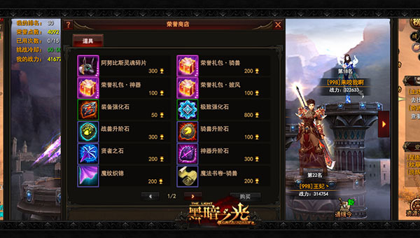 时空竞技是获得荣誉点的唯一途径,荣誉点可在荣誉商城中兑换奖品。玩家通过荣誉商城可购买到骑兽、神器、披风的技能书,还可兑换阿努比斯的神魂、装备升阶石等多种珍稀道具,等你来拿!