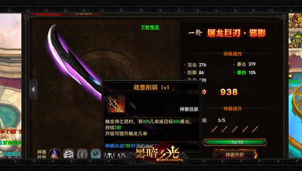 玩家在获得神器后,将拥有神器技能——神之怒,攻击时有一定概率触发神之怒伤害。随着升阶神器,将学会更多新的技能强化神之怒。比如,战意削弱:神之怒触发后一定概率是目标减少50%暴击,当属pk神技!