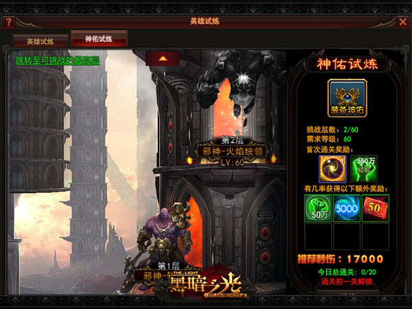 神佑试炼是一座60层的高塔,每层都有一个镇守的邪神。玩家从第一层开始,依次击杀每层的BOSS,即可进入下一层挑战。每完成一层挑战都将获得丰厚的奖励。每天最多可挑战10次,每层最多可挑战2次(按成功次数计算)。