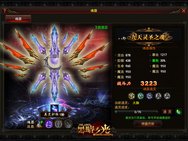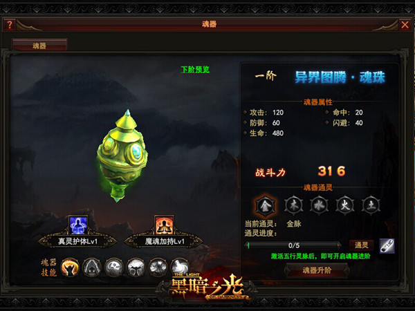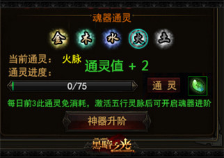 魂器开启后,此宝物会一直环绕在玩家身体周围。若想让魂器不断成长和强大,需激活金、木、水、火、土五个灵脉来对其进行通灵,每激活一个灵脉,都会获得一定的属性提升。通灵完成后即可对魂器进阶。