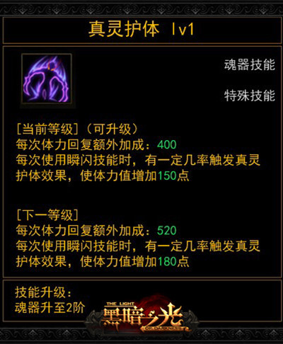 真灵护体——可提升每次体力值的恢复,在跳跃时,还有几率减免体力的消耗,减免值随技能升级而提升。