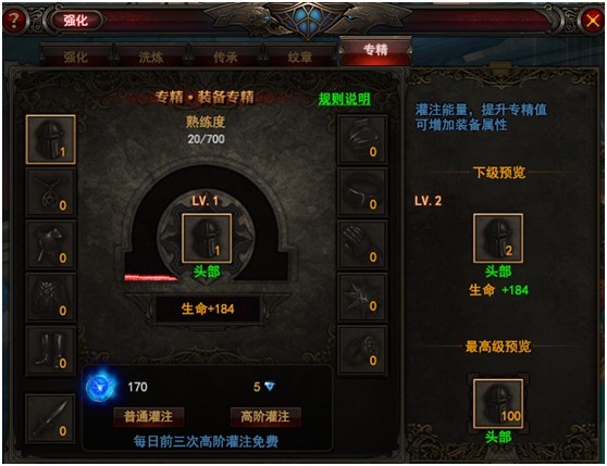 想更加完美的将装备的威力发挥到极致吗?装备专精可以帮你实现愿望,通过灌注时空能量增加熟练度可以升级装备专精级别,装备专精度不会因为你更好装备而发生改变。