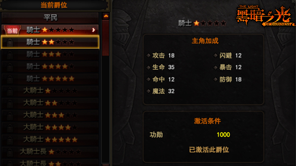 通过完成主线任务,开启爵位系统。初始爵位为平民,爵位及星级会显示于角色名字之上。爵位共有10级,从低到高分别为骑士、大骑士、大骑士长、勋爵、男爵、子爵、伯爵、侯爵、公爵、大公爵。爵位越高,角色属性加成越来越多,日积月累之后,当达到大公爵的时候,会获得大量的属性加成。