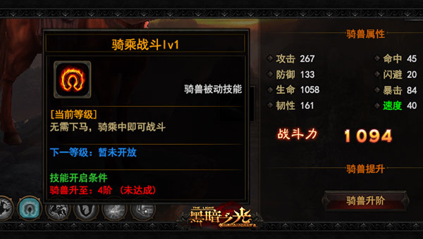 骑兽升阶:骑兽升阶不用达到特别条件,直接可以升阶,升阶需要消耗一定骑兽升阶石和金币。